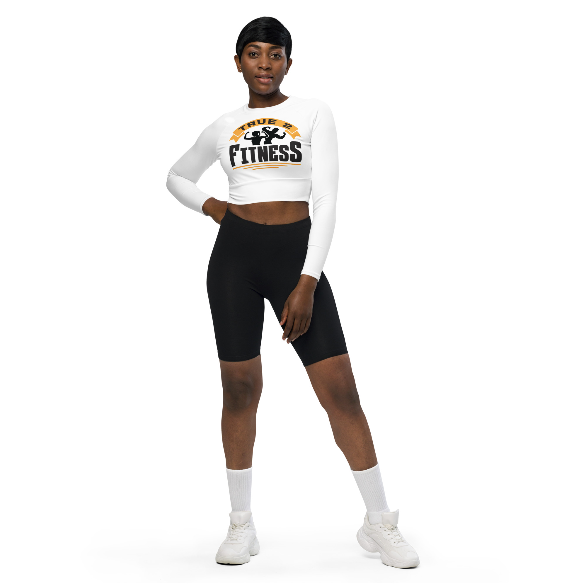 This long-sleeve crop top is made of recycled polyester and elastane, making it an eco-friendly choice for swimming, sports, or athleisure outfits. The crop top has a tear-away care label and a wide, double-layered waistline band for a comfortable fit.